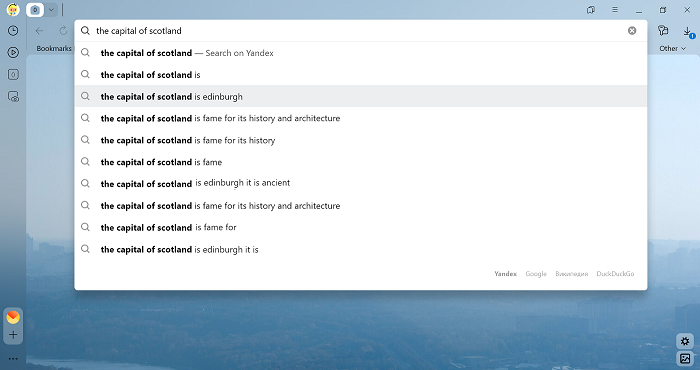 The SmartBox is the main Yandex Browser element for entering URLs and searching for information. The Yandex search engine is normally used to search for answers to your query. You can change your search engine if you want to. You can't disable or remove the SmartBox.
