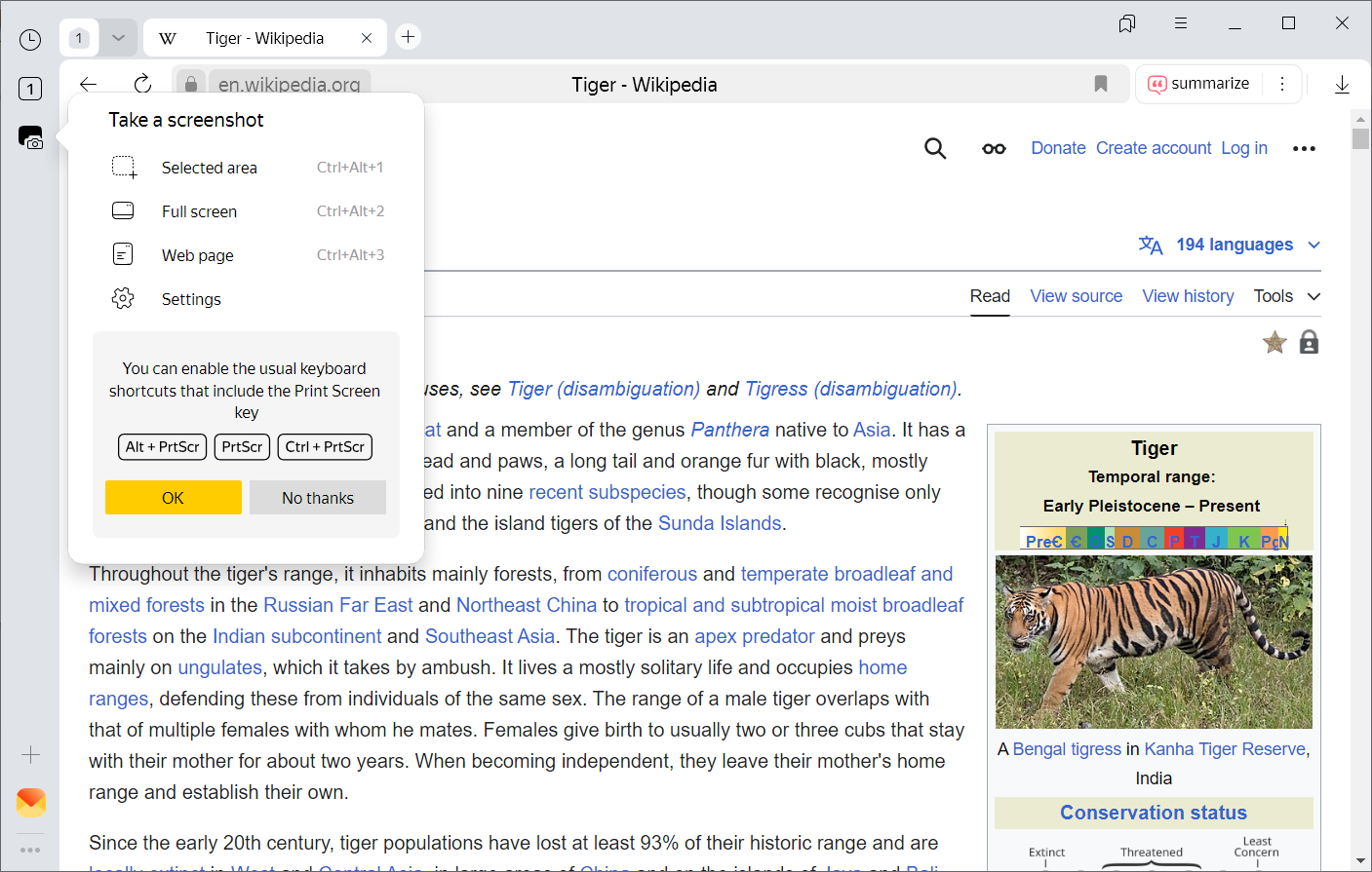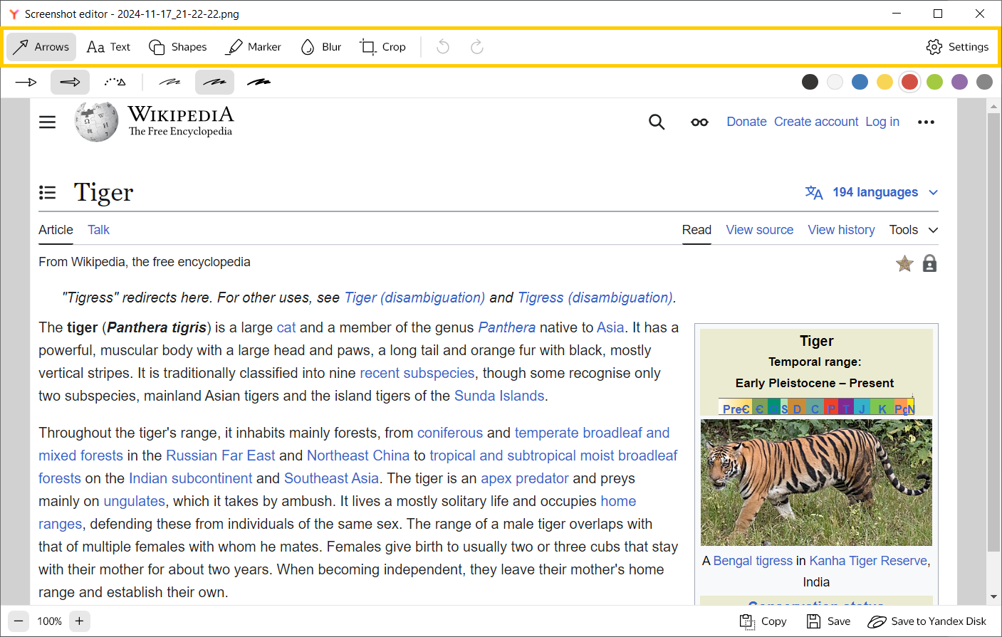 In Yandex Browser, you can take screenshots of the entire screen, the selected area, or the entire web page, edit the image, and add arrows and text to it. You can send a screenshot to your friends or to support.