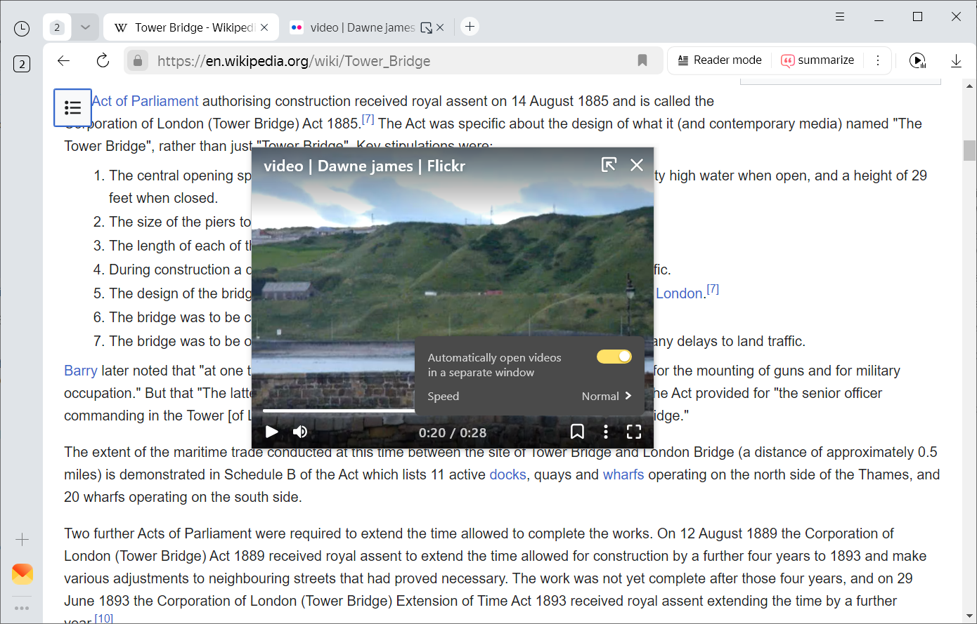 You can view videos in a separate Yandex Browser window. For example, you can simultaneously launch an app and accompanying video instructions. The video player window is displayed on top of the other windows so you can watch it no regardless of the application you are using. You can resize the window or drag it anywhere on the screen. The video will continue even if you minimize Yandex Browser. If a video in HTML5 format contains subtitles (for example, videos on YouTube have the  icon on the control panel), they'll also appear in a new window.