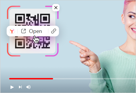 Yandex Browser can recognize QR codes on videos and display their contents. Browser highlights the QR code with a colored frame and shows the options to follow or copy the link.