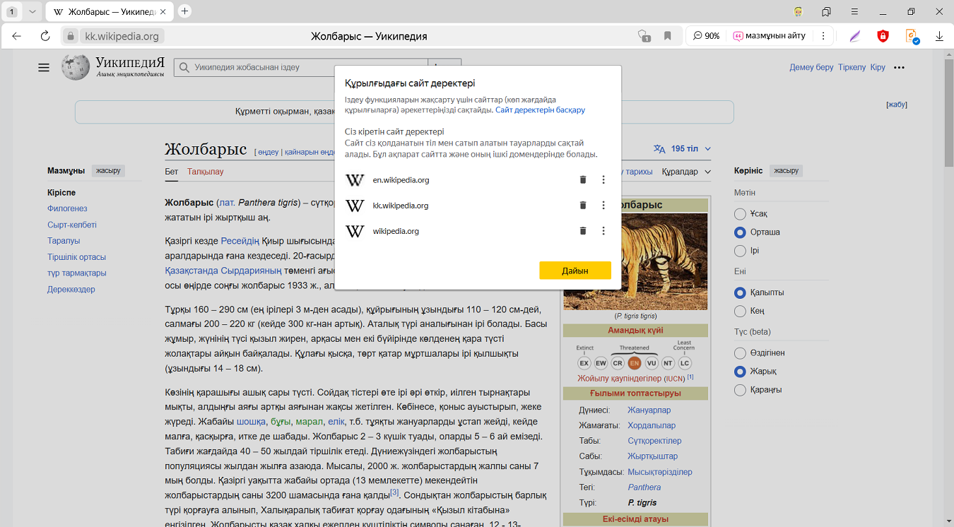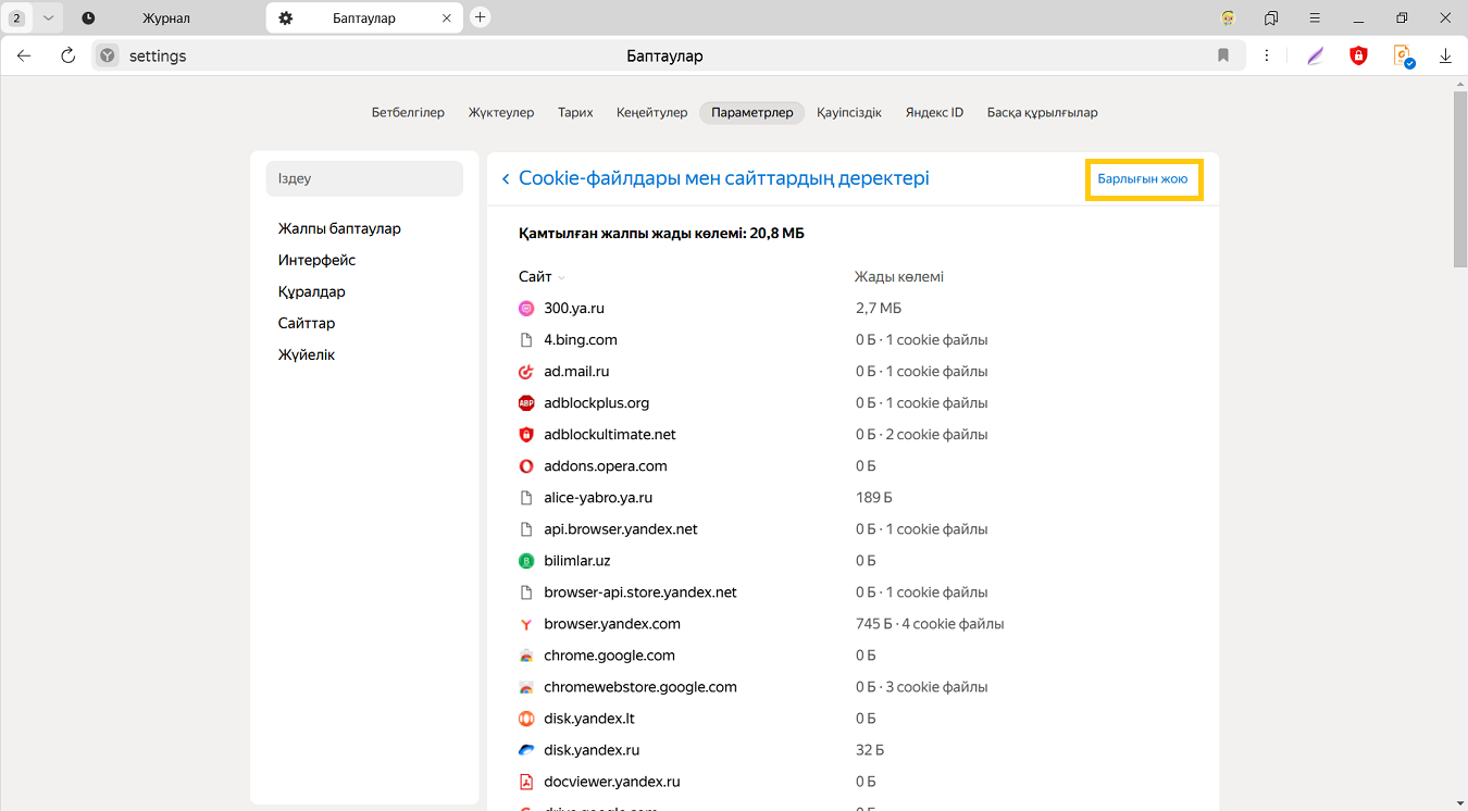 Егер сіз барлық cookie файлдарын жойсаңыз, барлық сайттардағы аккаунттардан автоматты түрде шығасыз және себеттегі тауарлар жоғалып, геолокация дұрыс болмауы мүмкін.