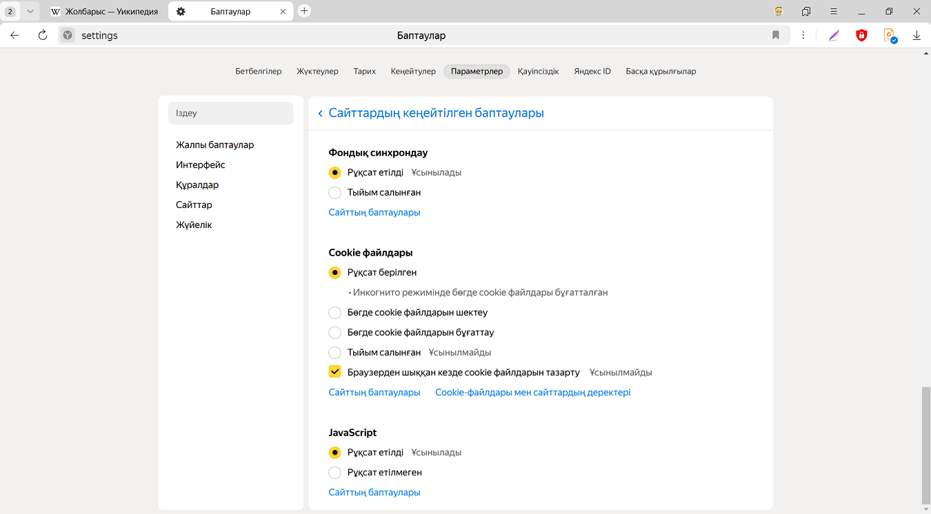 Әдепкі бойынша Яндекс Браузерінде cookie файлдарын сақтауға рұқсат етіледі.