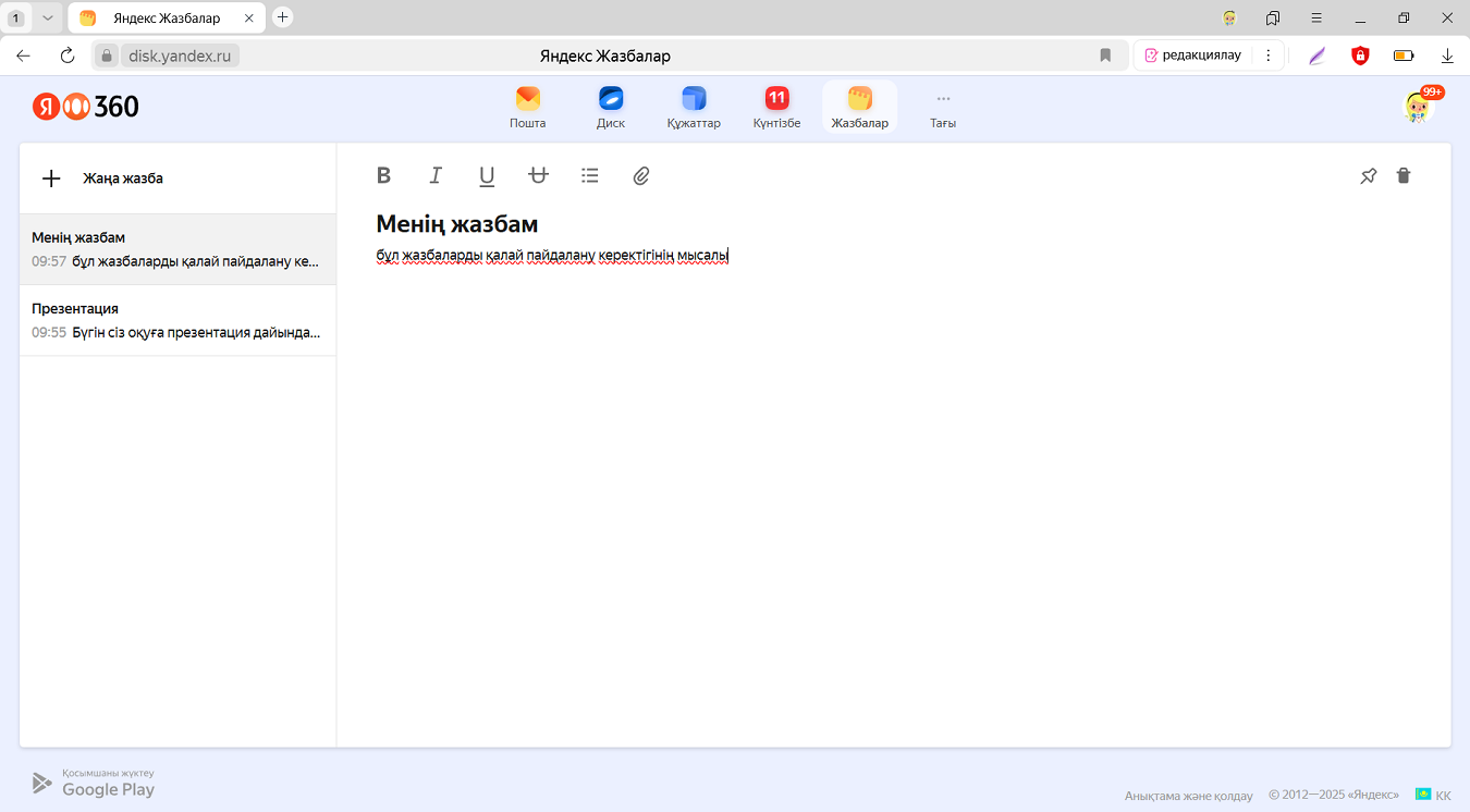 Ескертпе құру — терезенің жоғарғы сол жақ бұрышында Жаңа ескертпе батырмасын басыңыз. Жазбаларды толтыру кезінде мына белгішелерді пайдаланыңыз: