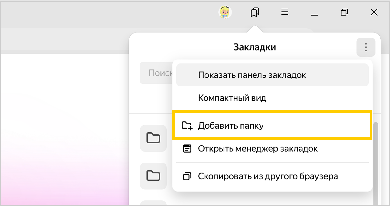 Справа от Закладки нажмите Меню → Добавить папку.