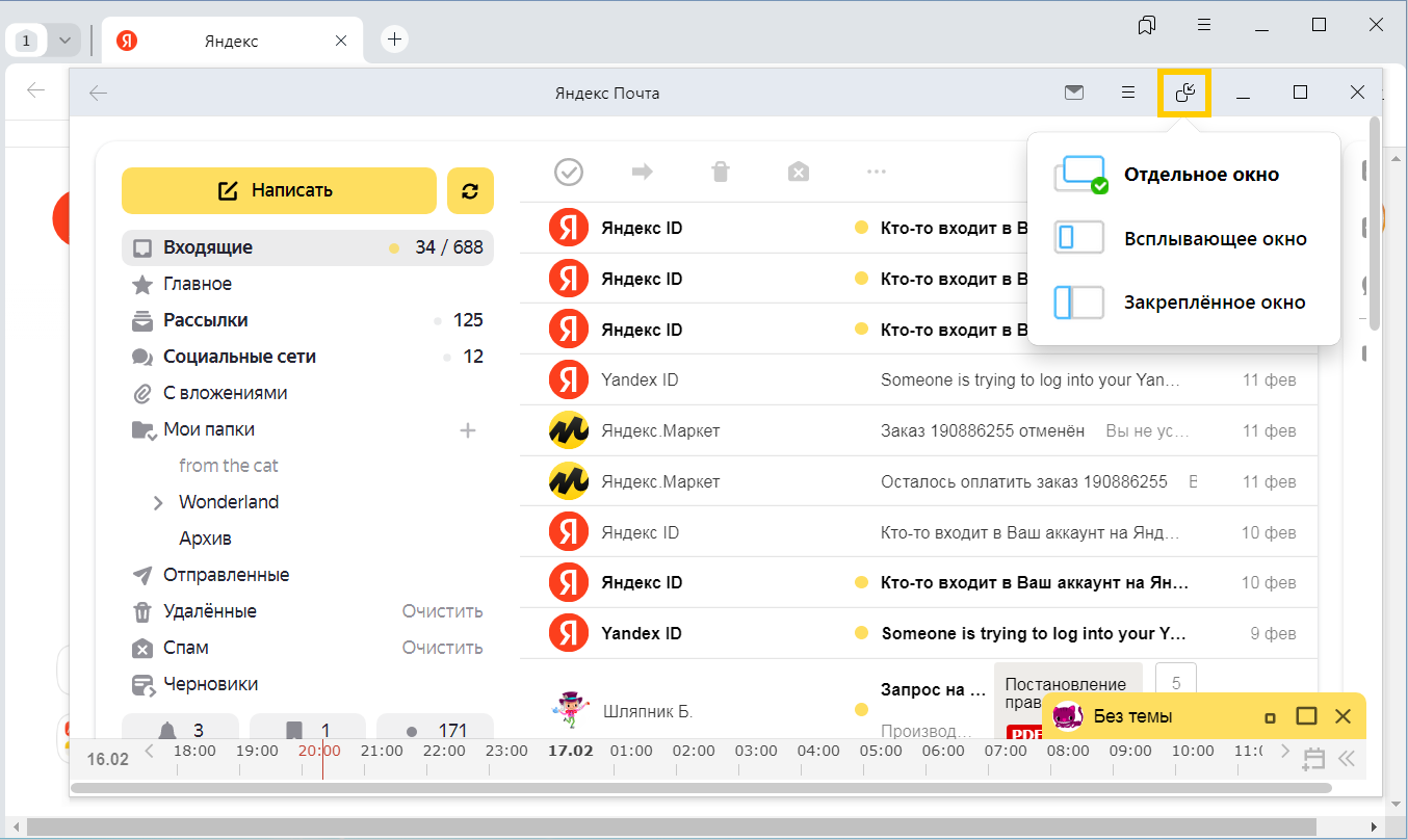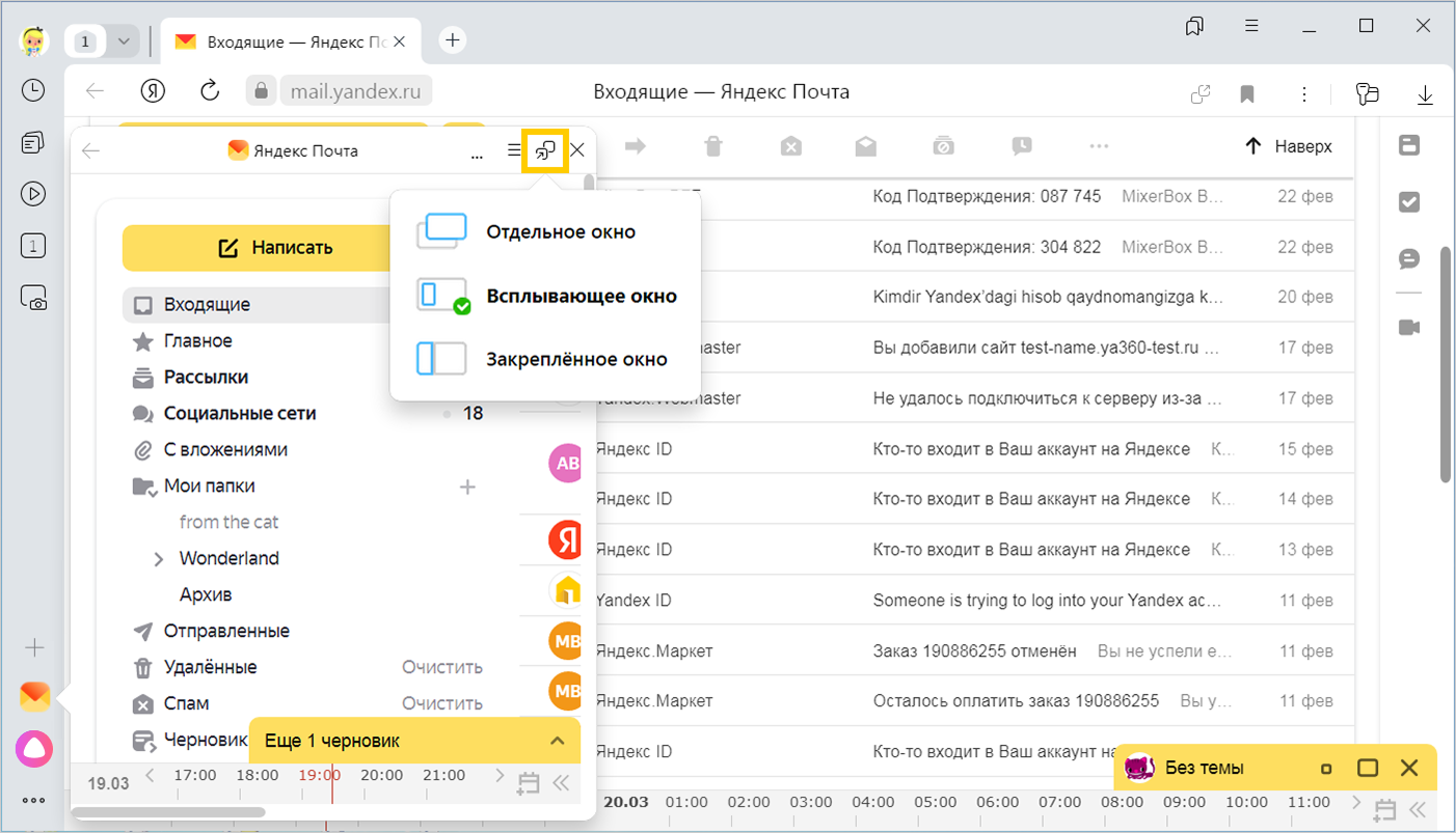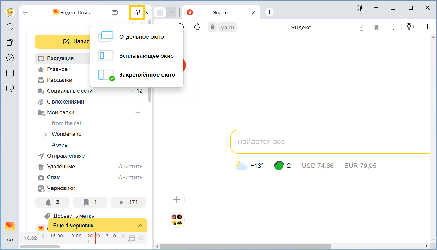 В этом режиме вы можете видеть еще один сервис (чаты, почту, онлайн-трансляцию), когда работаете с основным окном.