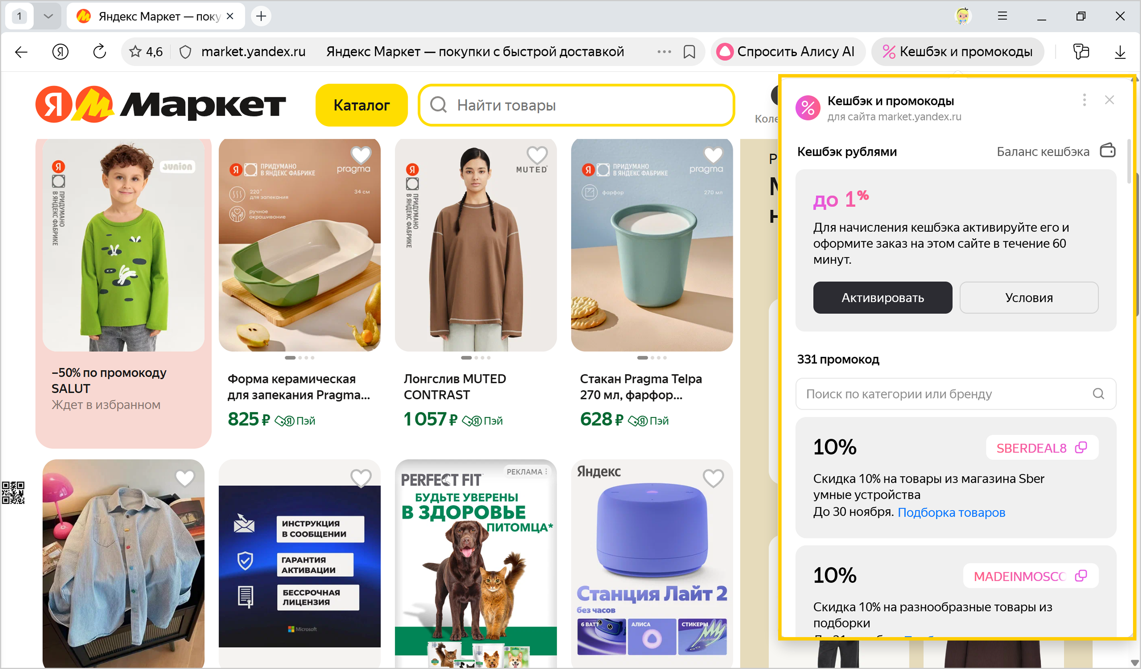 Яндекс Браузер помогает экономить при покупках на сайтах интернет-магазинов — получать кешбэк с покупок и находить доступные промокоды.