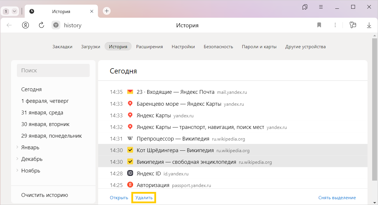 Удаление страниц из истории