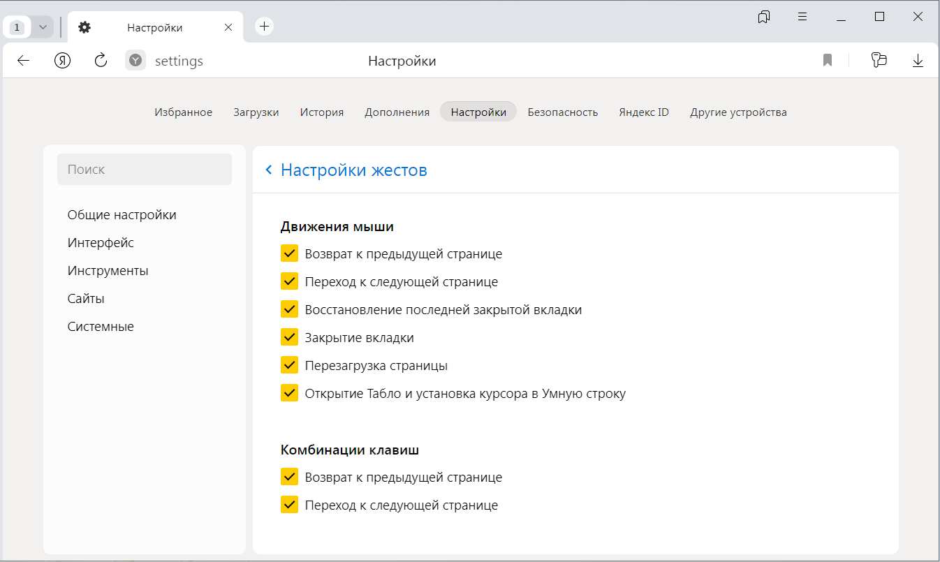 По умолчанию поддержка жестов мыши в настройках Яндекс Браузера отключена. Чтобы использовать жесты мыши: