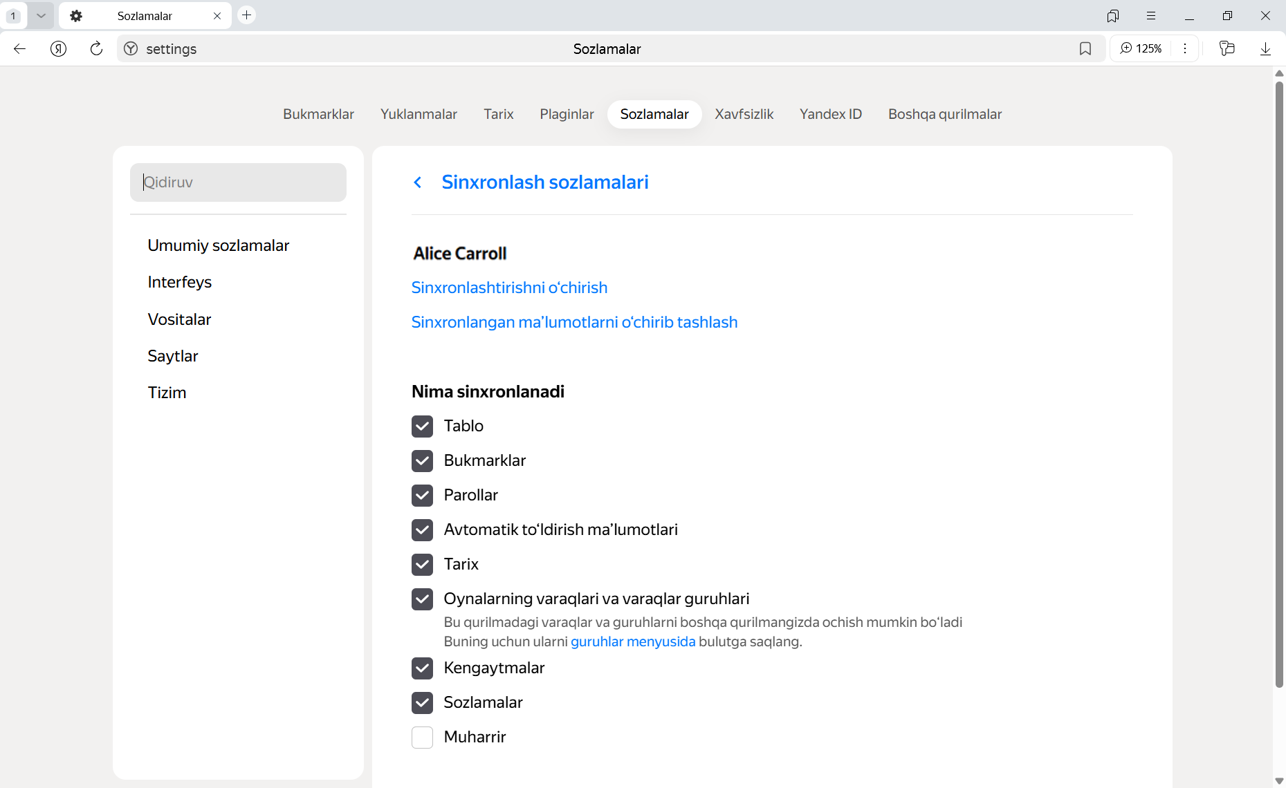 Odatiy sozlamalarda Tablo, xatchoʻplar, parollar, xaritalar, avtomatik kiritish ma’lumotlari, tarix, varaqlar va varaqlar guruhlari (agar ularni guruhlar menyusida bulutli qilgan bo‘lsangiz), kengaytmalar va sozlamalar sinxronlanadi.
