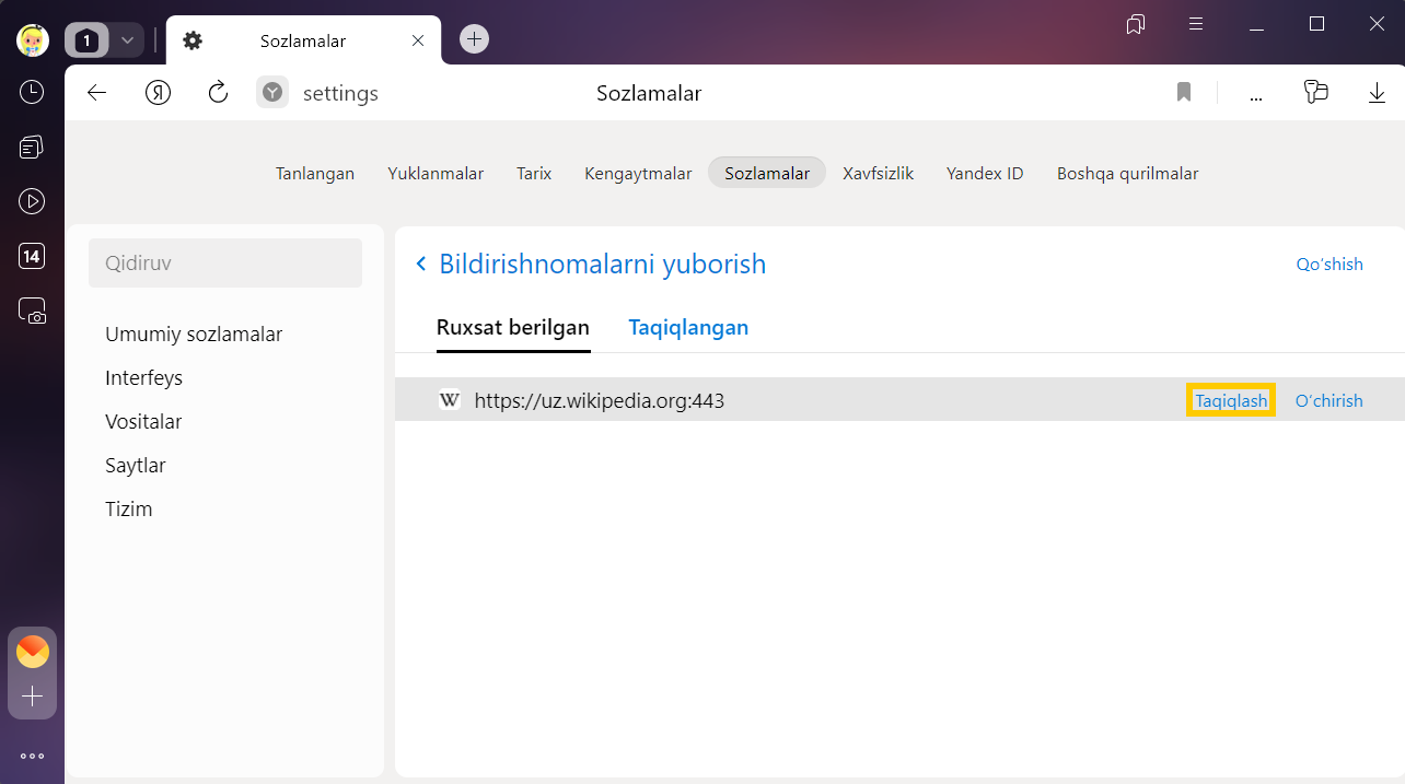 Saytdan ogohlantirishlarni olishni taqiqlash yoki ruxsat berish