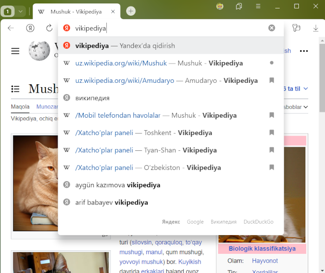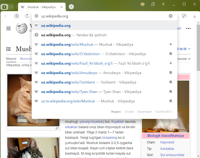 Maslahatlar ro‘yxati qidirish satri ostida paydo bo‘ladi va qidirish satridagi yangi belgilar kiritilganda yangilanadi. Agar so‘rovingizga mos keladigan maslahatni ko‘rsangiz, uni sichqoncha yoki Yuqoriga yoki Pastga klavishlari yordamida tanlashingiz mumkin. Qidiruv natijalariga o‘tish uchun Enter tugmasini bosing.