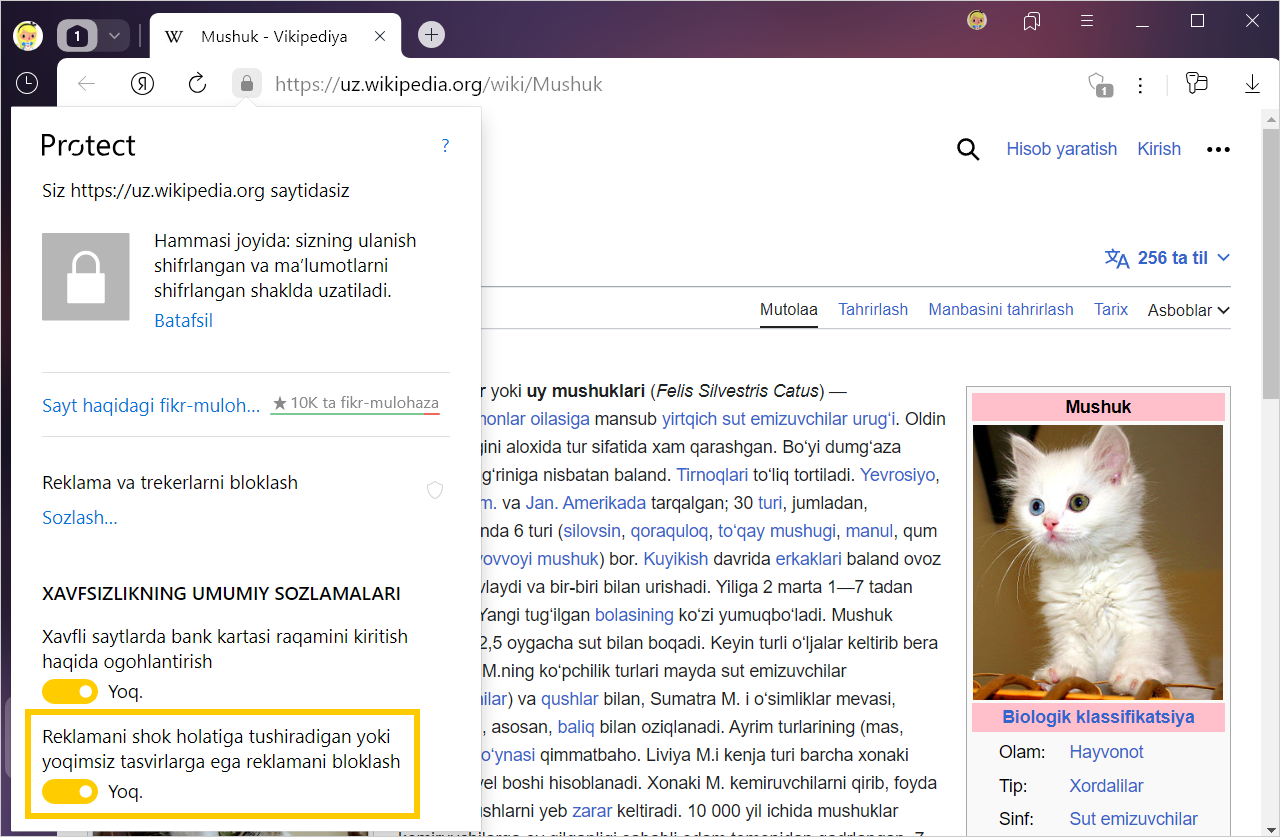 Ochilgan oynadagi Umumiy xavfsizlik sozlamalari blokida Zararli yoki yoqimsiz tasvirlar aks etgan reklamani bloklash parametrini yoqing yoki o‘chirib qo‘ying.